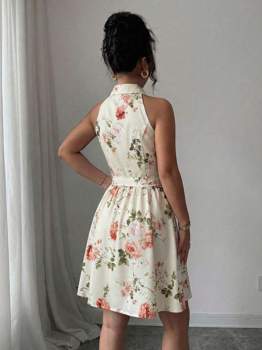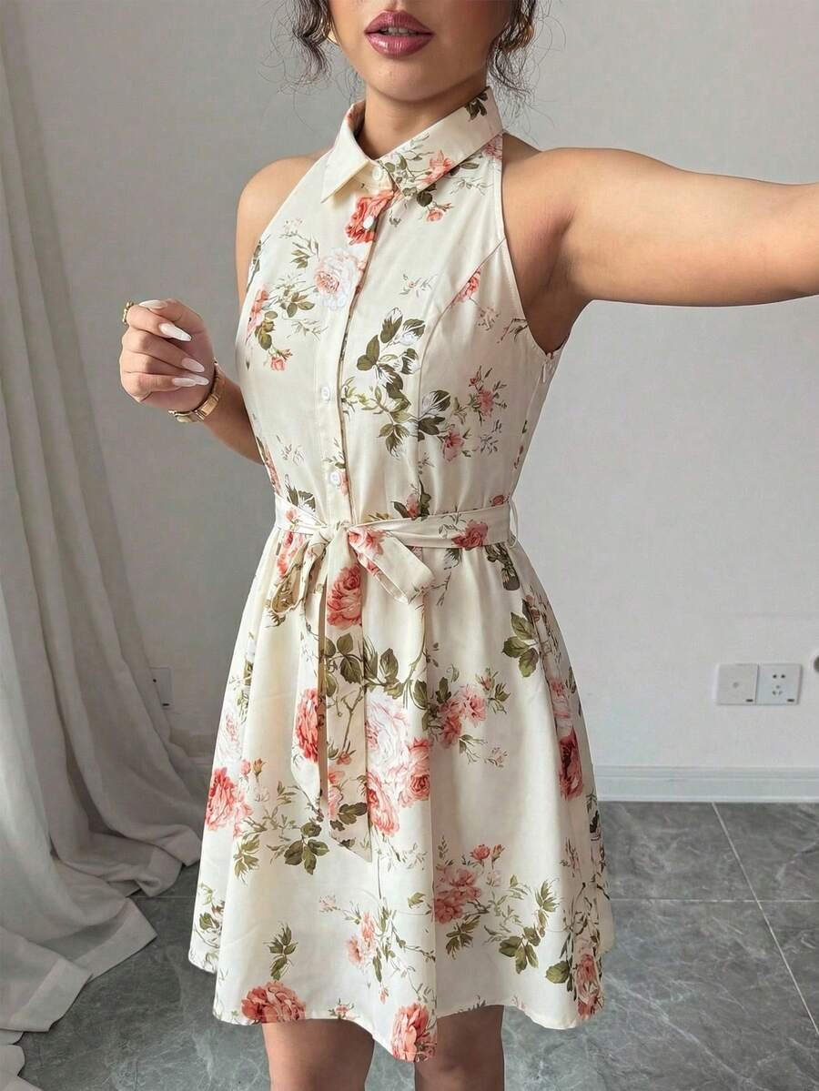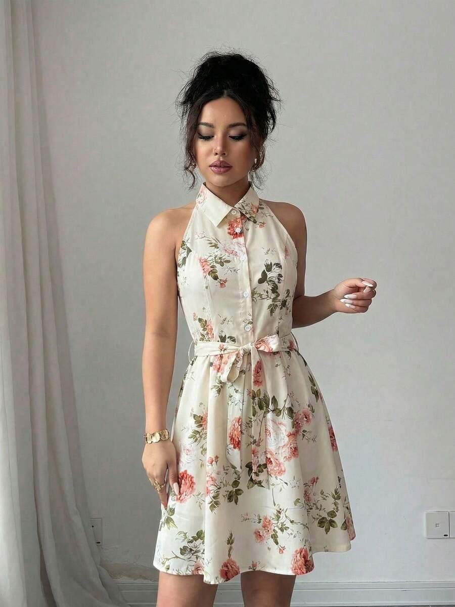 Blooming with romantic pink roses on a crisp cream background, this stunning boho dress brings together timeless femininity and effortless summer charm in one irresistible silhouette. The halter collar neckline with button-down front detail and self-tie waist belt cinches beautifully at the high waist, while the flared A-line skirt swirls with every step for that perfect garden-party twirl. Whether you’re headed to a wedding guest event, a brunch date, or a sun-drenched vacation, this sundress works flawlessly for every warm-weather occasion.