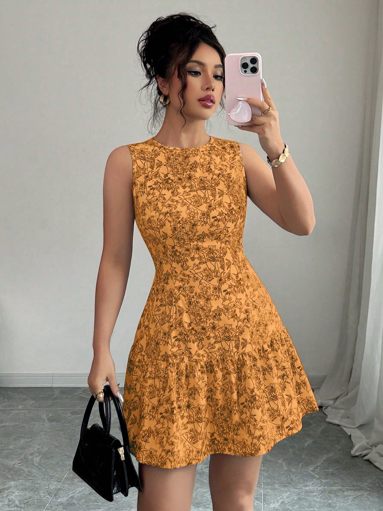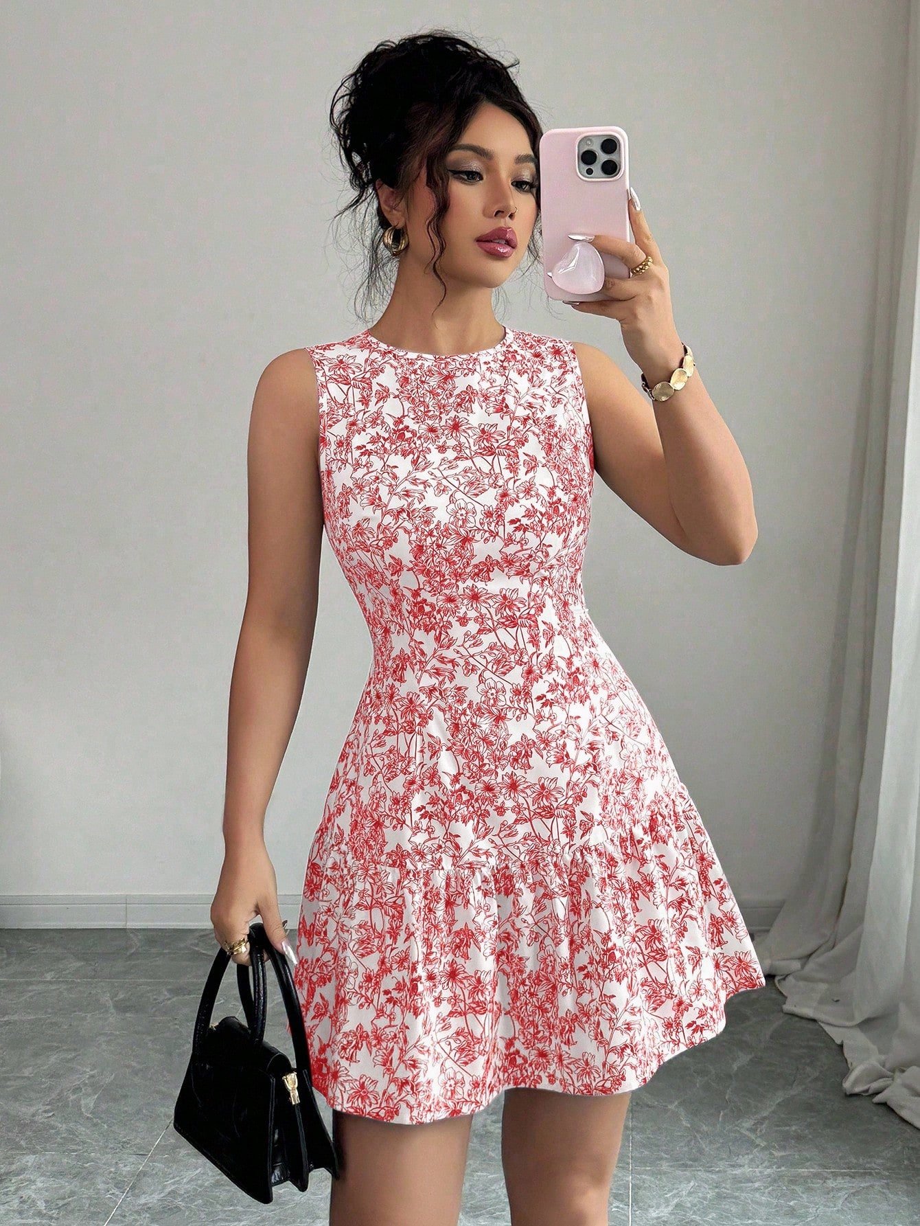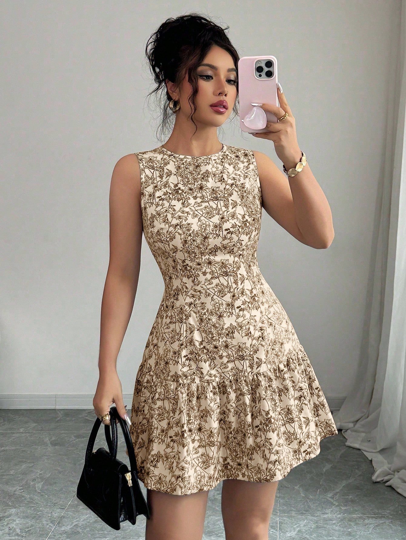 This effortlessly chic floral dress features a delicate black-and-white all-over botanical print that gives serious French garden vibes. The sleeveless A-line silhouette with a ruched high waist and flounce ruffle hem creates a beautifully feminine shape that moves with you all day long. Perfect for night outs, brunches, graduation celebrations, or any occasion that calls for a little extra charm — this is the mini dress that does it all.