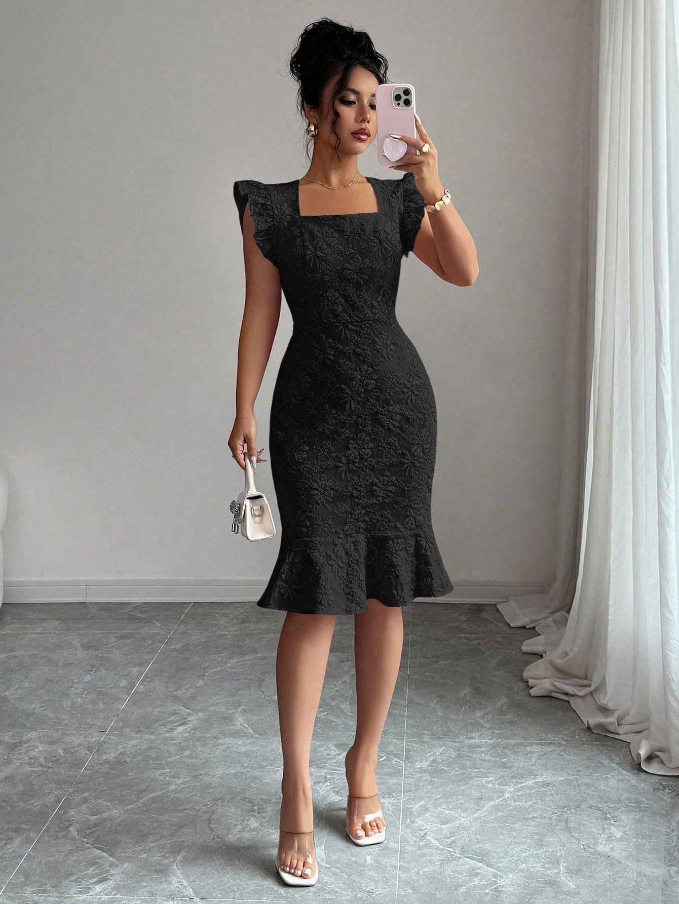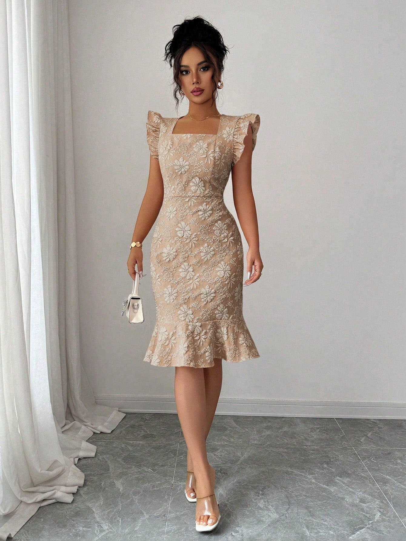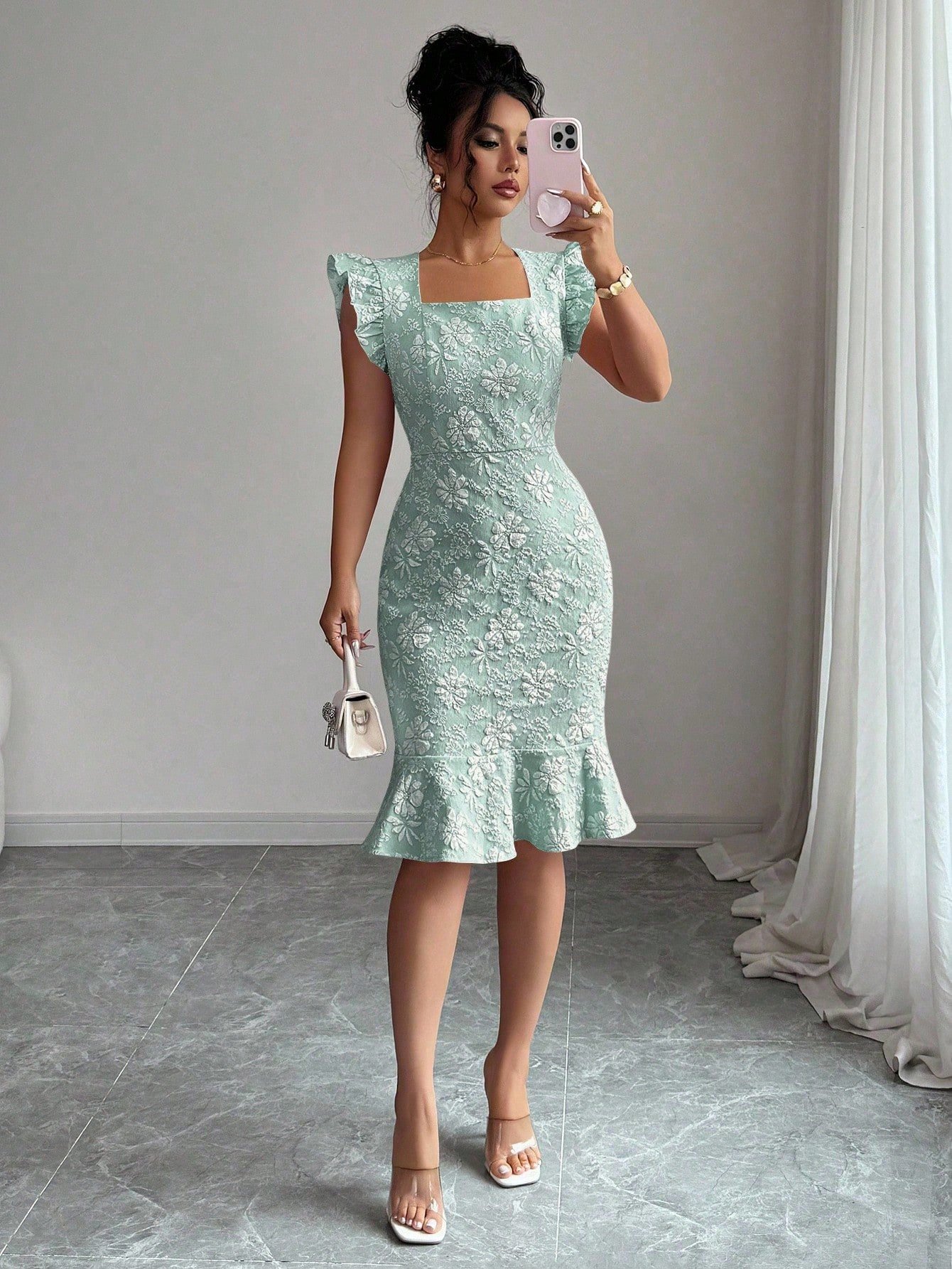 This stunning midi dress is the definition of effortless elegance. Crafted in a sophisticated gray-blue jacquard woven fabric with an all-over floral texture, this fitted silhouette hugs every curve with a high-waist slim fit and a show-stopping mermaid ruffle hem that adds serious drama from the knee down. The square neckline frames the décolletage beautifully, while the delicate cap puff sleeves elevate the look from simply pretty to truly polished — perfect as a formal dress for women heading to an evening event, cocktail party, or upscale dinner.