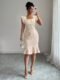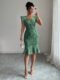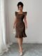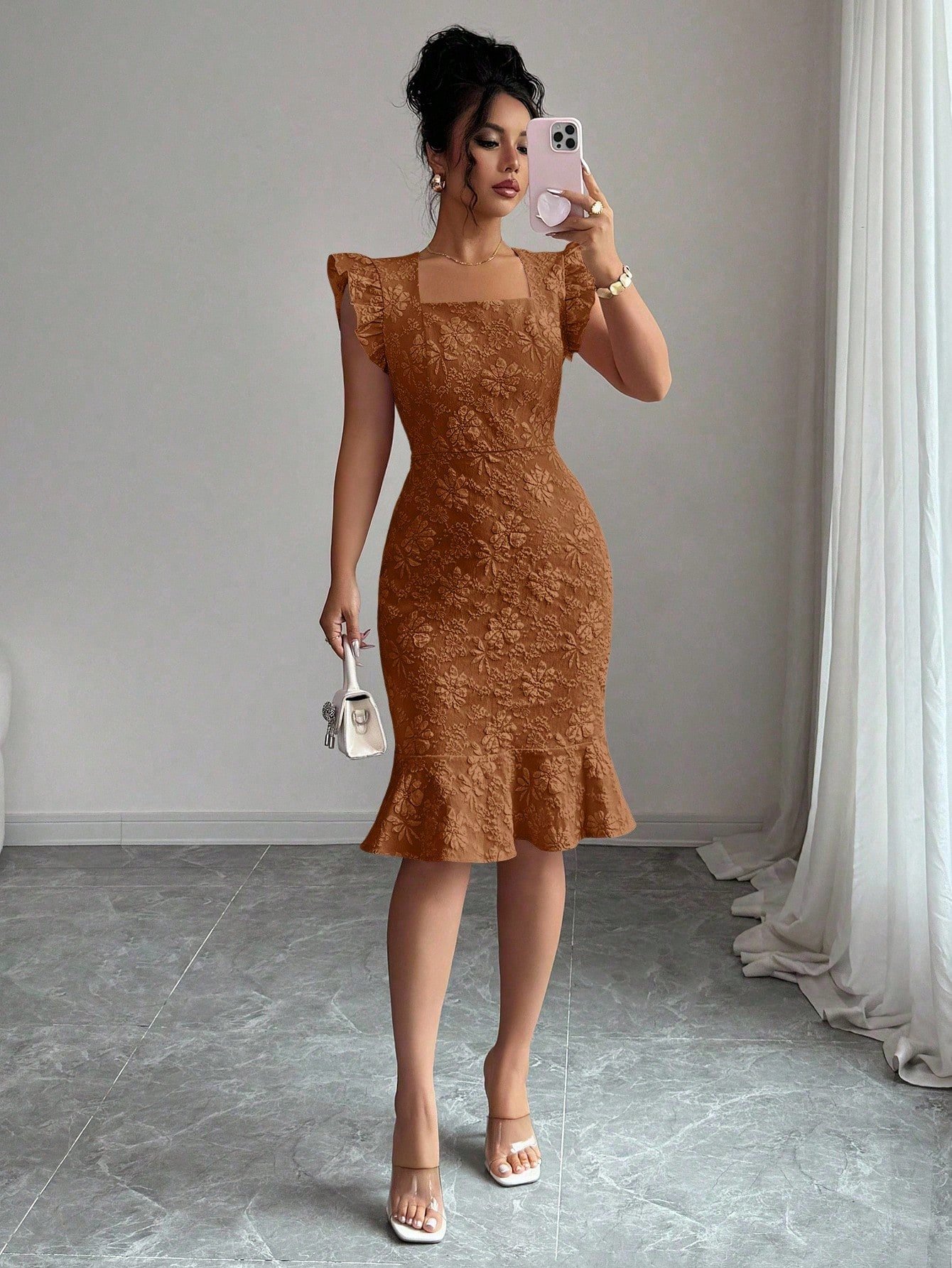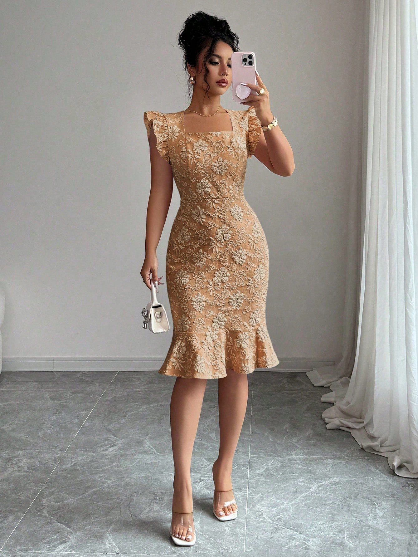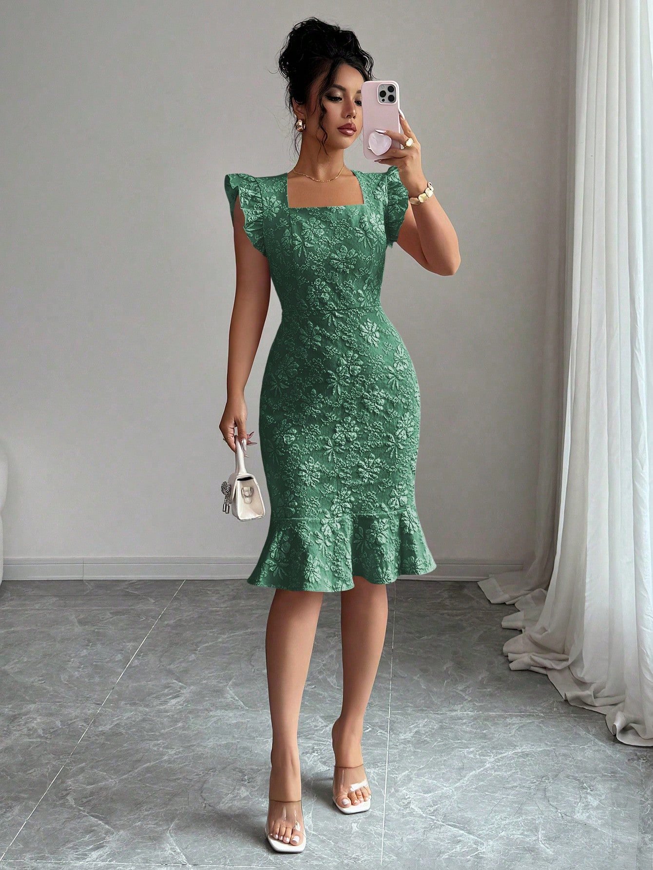 This stunning midi dress is the definition of effortless elegance. Crafted in a sophisticated gray-blue jacquard woven fabric with an all-over floral texture, this fitted silhouette hugs every curve with a high-waist slim fit and a show-stopping mermaid ruffle hem that adds serious drama from the knee down. The square neckline frames the décolletage beautifully, while the delicate cap puff sleeves elevate the look from simply pretty to truly polished — perfect as a formal dress for women heading to an evening event, cocktail party, or upscale dinner.