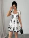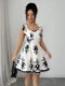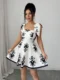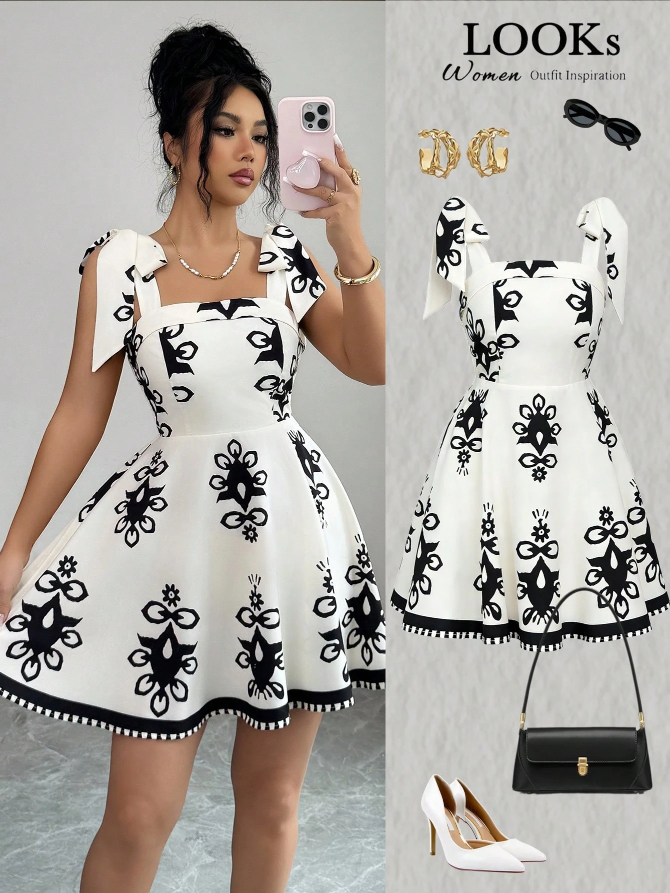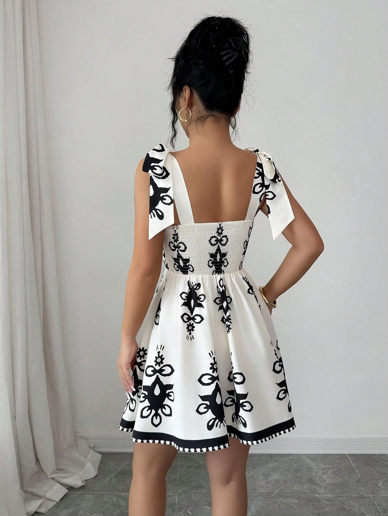 Bold, graphic, and impossibly chic, this striking black-and-white ornamental print mini dress delivers high-fashion energy in every single detail. The square neckline with tie-knot puff shoulders frames your décolletage beautifully, while the shirred high waist and dramatically flared A-line skirt create a silhouette that’s equal parts playful and polished. Finished with a delicate pom-pom trim hem, this is the kind of cute dress for women that turns every sidewalk into a runway.